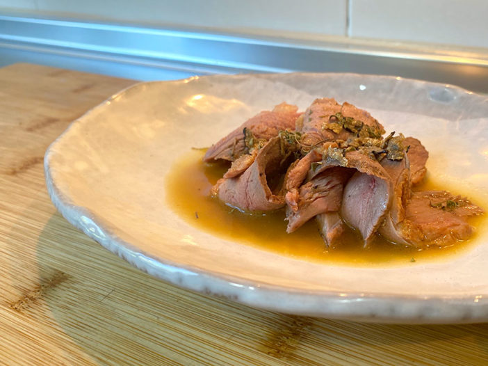 Una vez reposado, cortar el magret lo más fino posible a modo de roastbeef.
