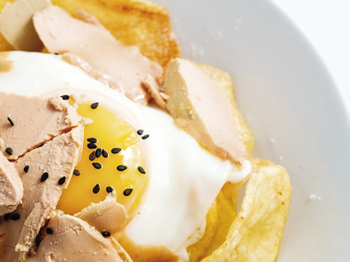 Emplatamos y colocamos los espárragos superpuestos sobre el foie gras de pato fresco extra.